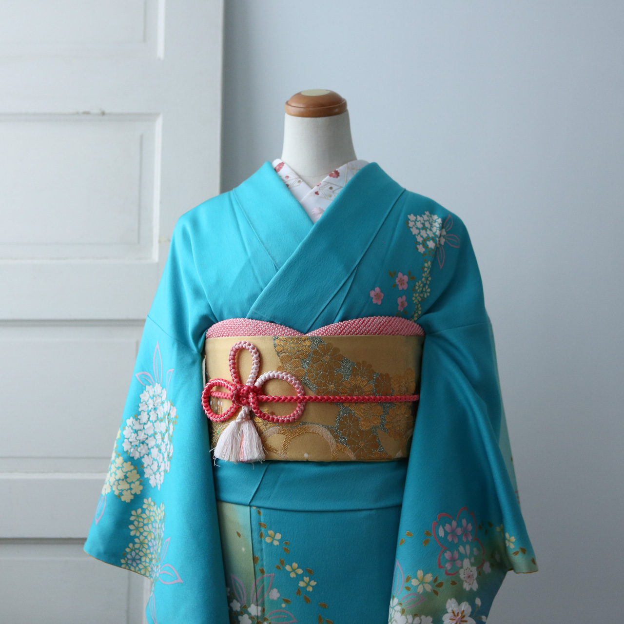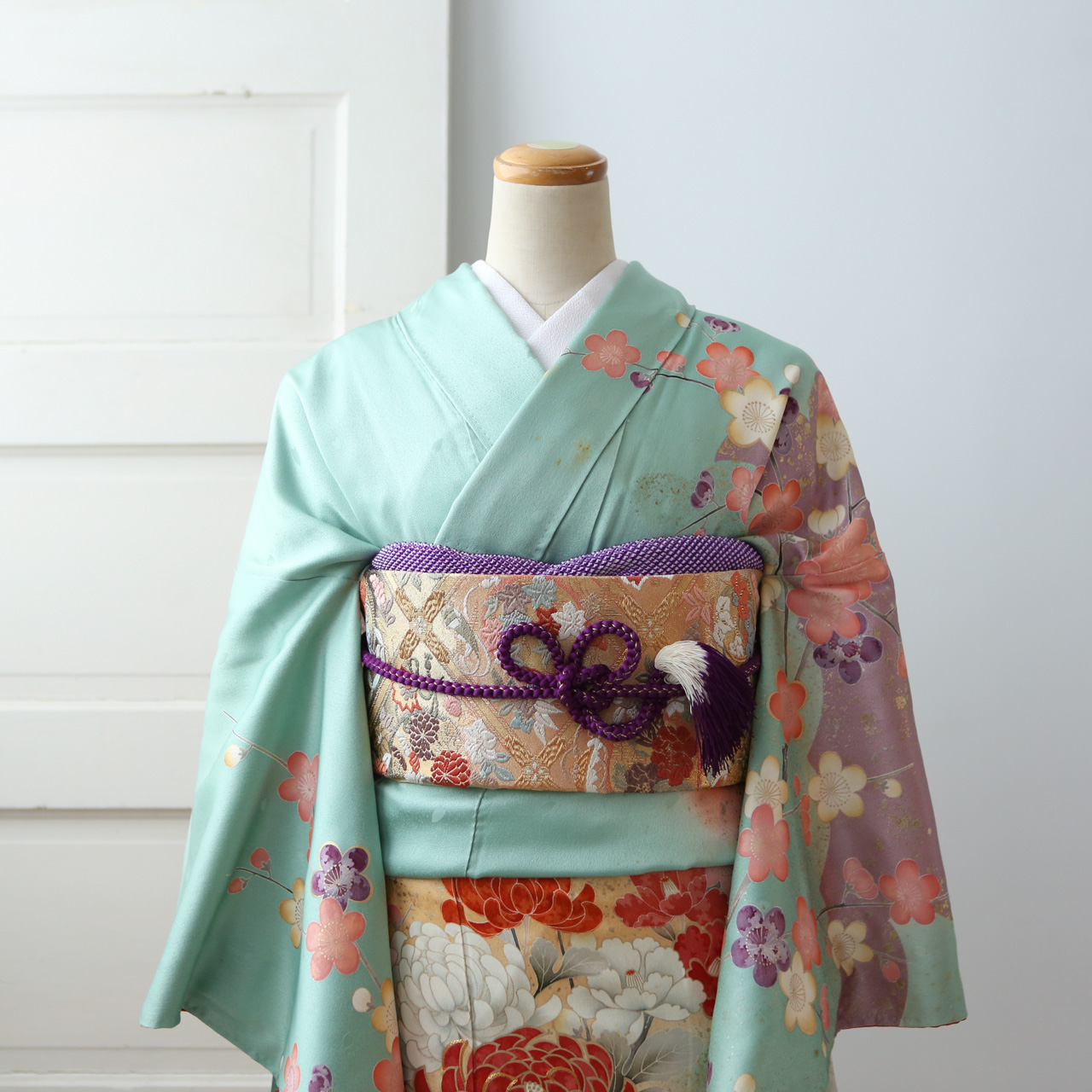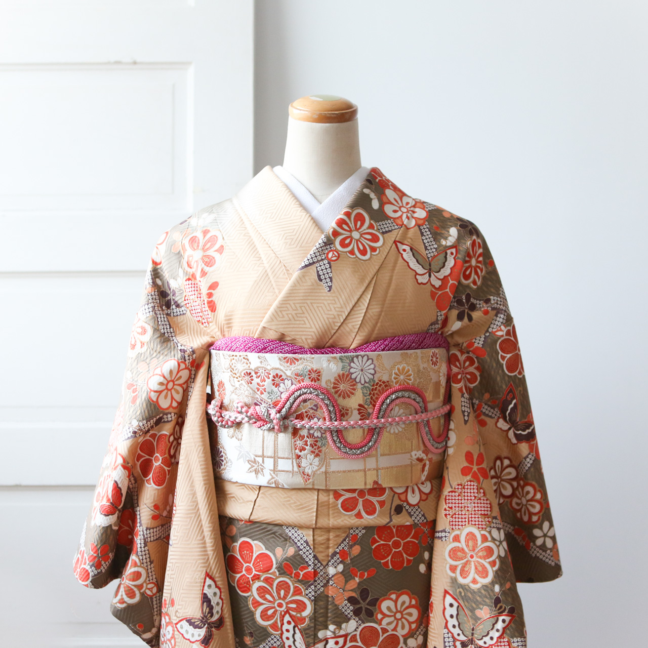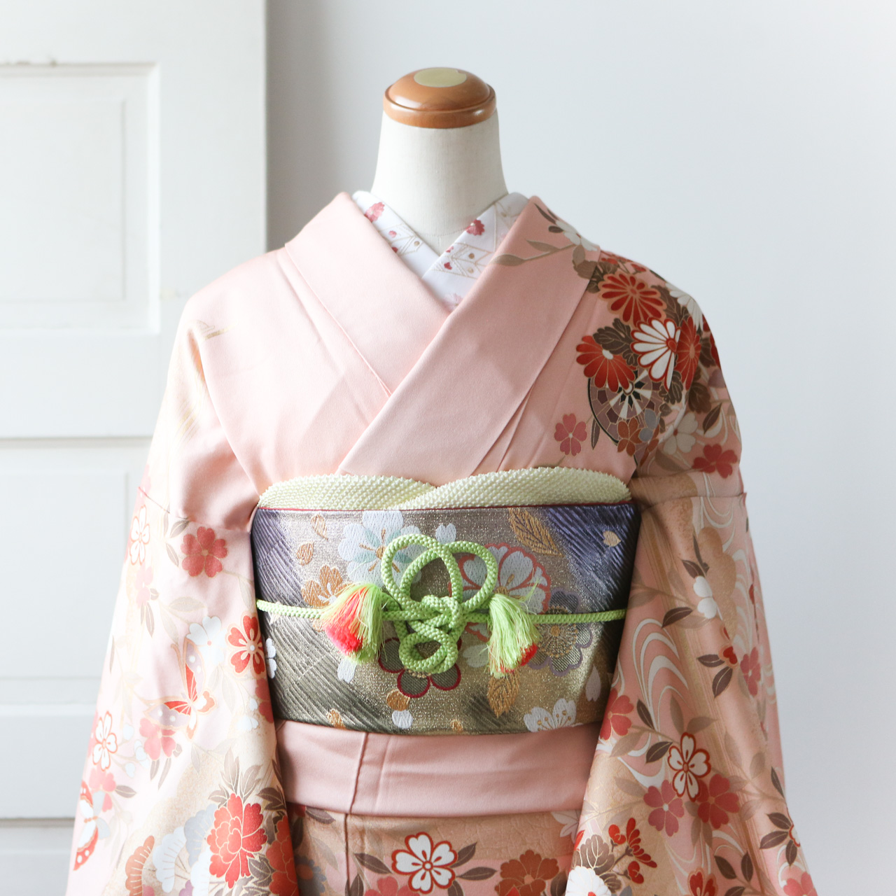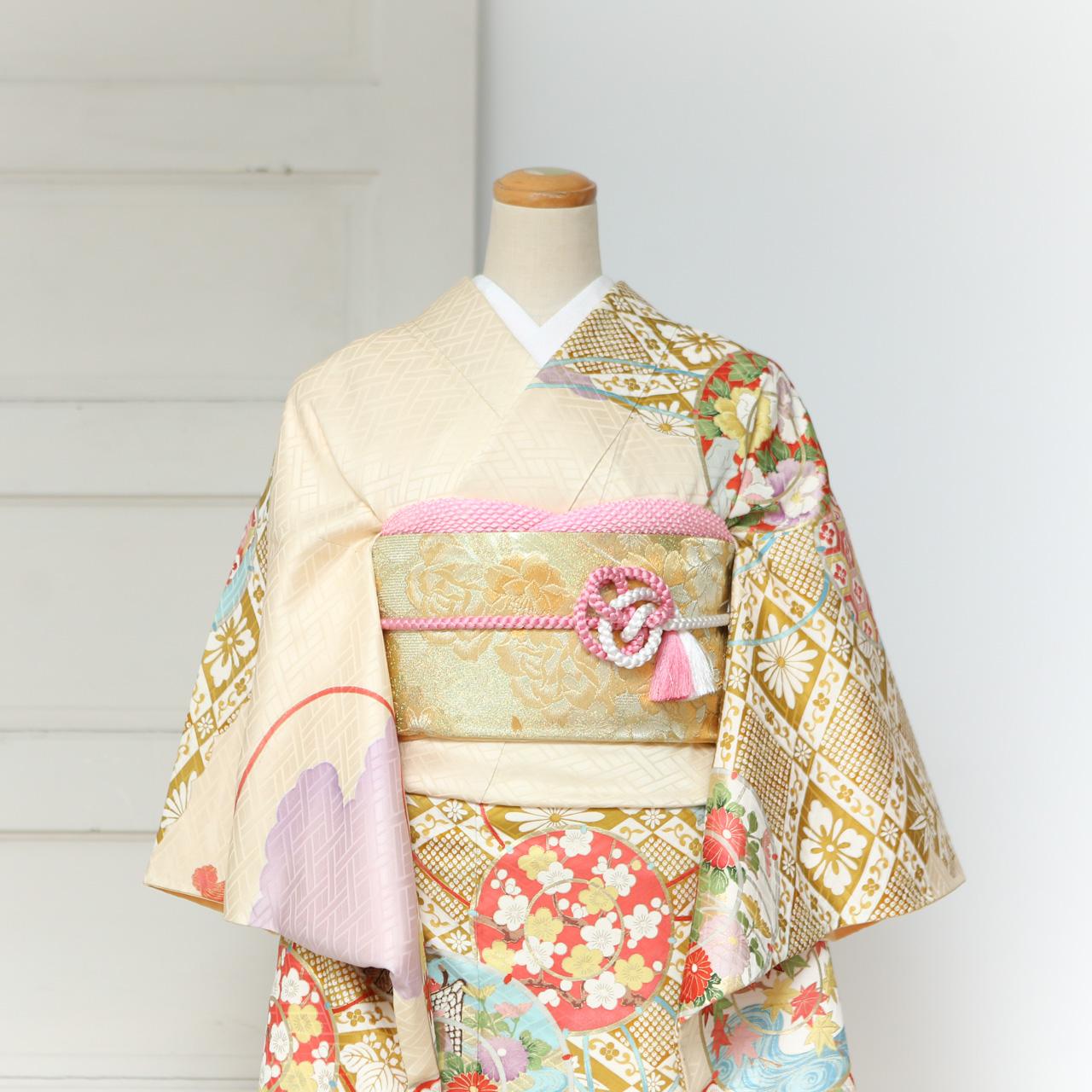 BEIGE BLUE PINK ヴィンテージ 振袖