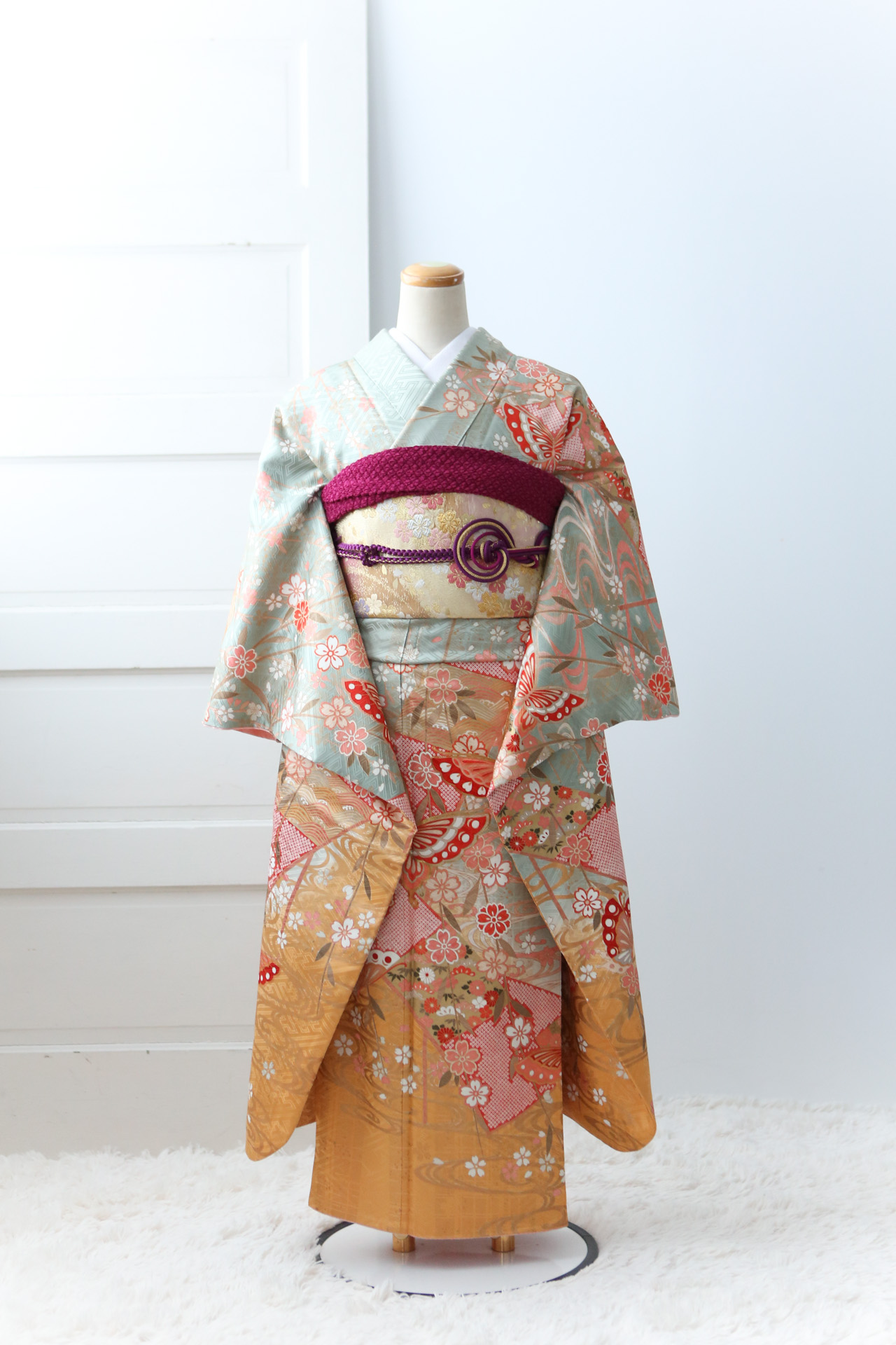 鶯色のトップから裾にかけてオレンジのグラデーションが美しいです。ゴールドの帯にえんじ色の帯揚げ可愛らしいコーディネートです。