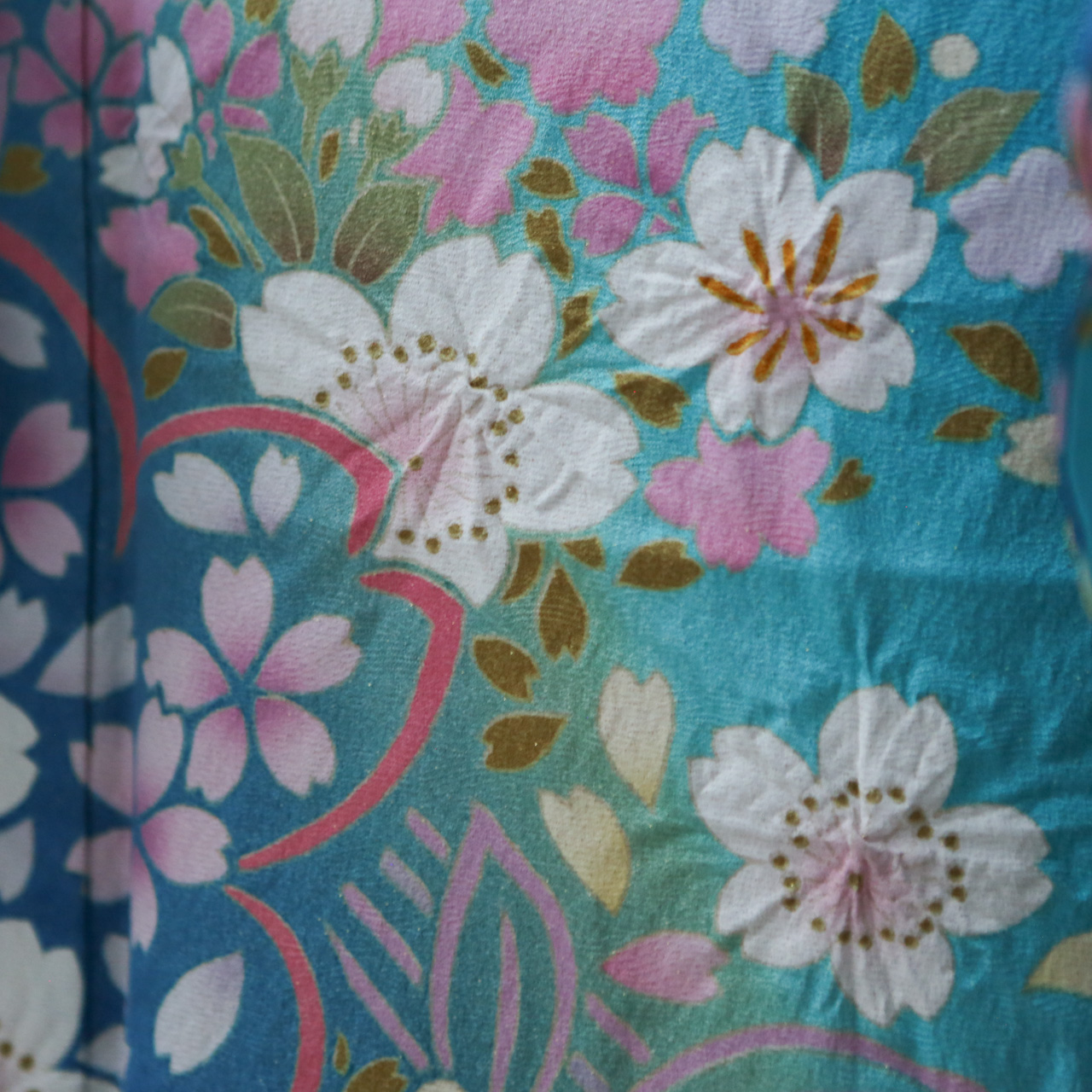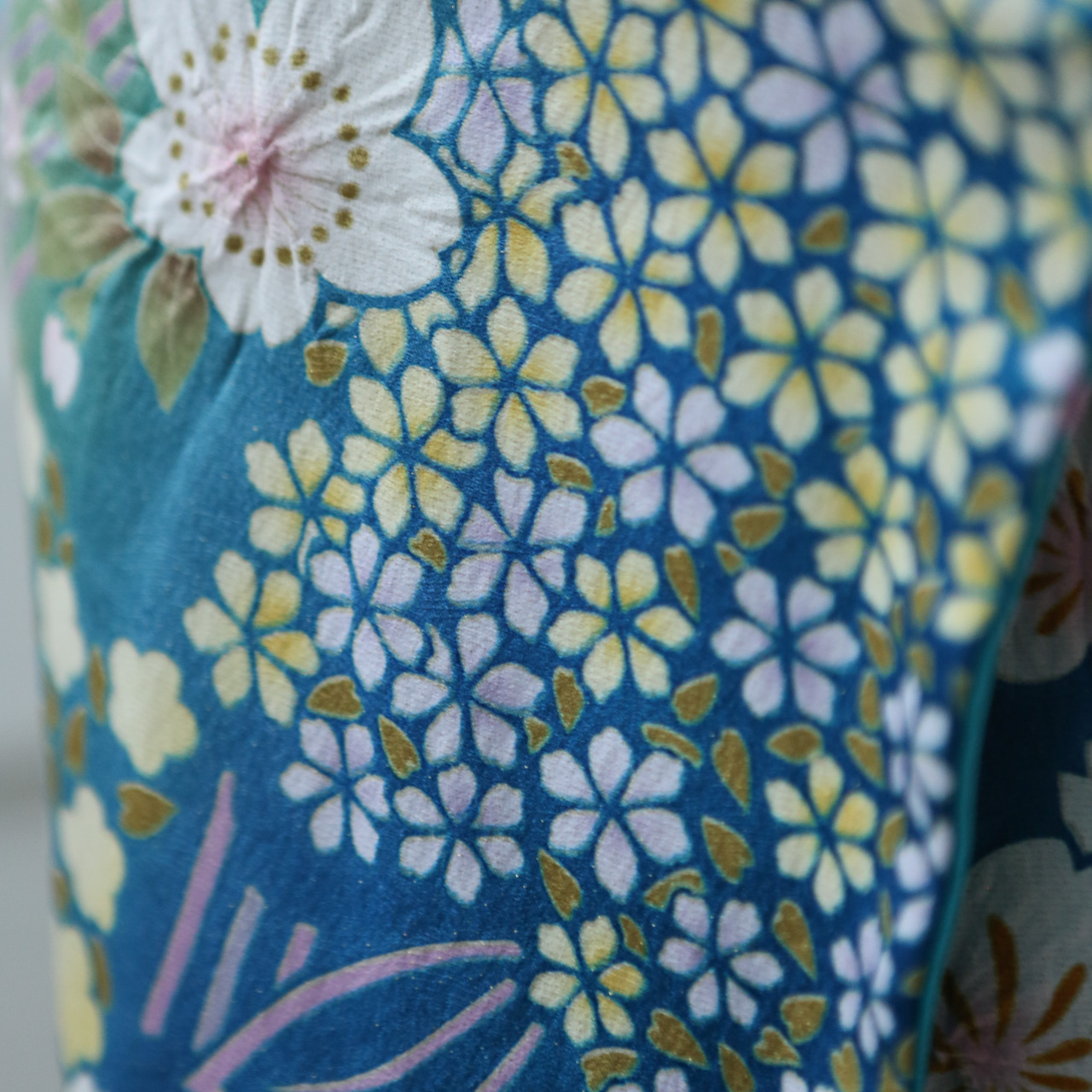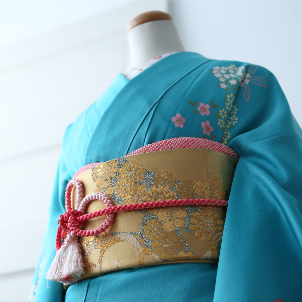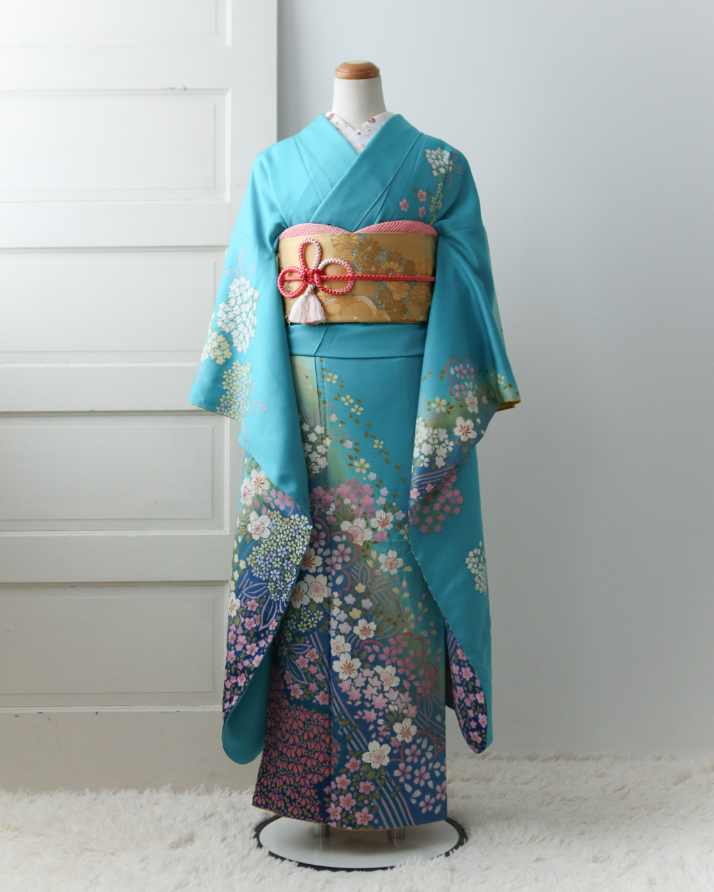 スカイブルーに花柄模様が広がる着物にゴールドの帯が可愛らしいコーディネートです。
