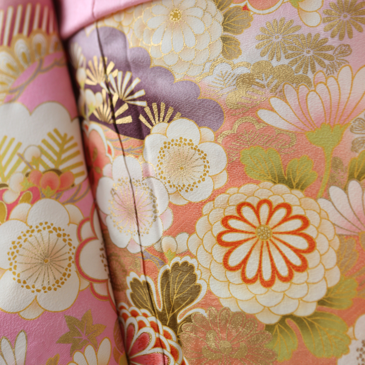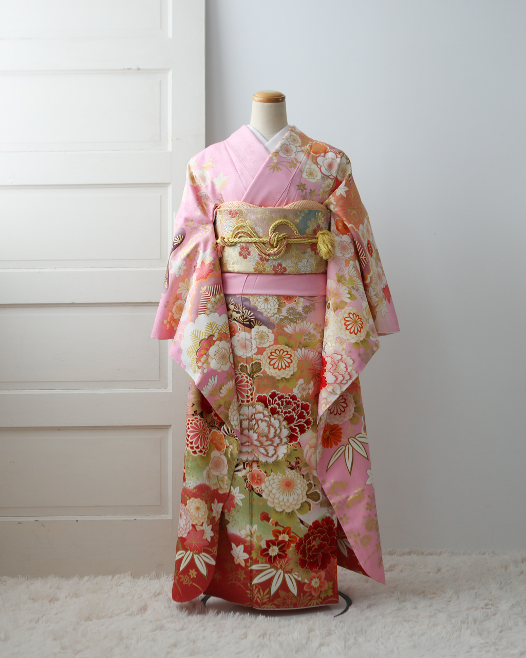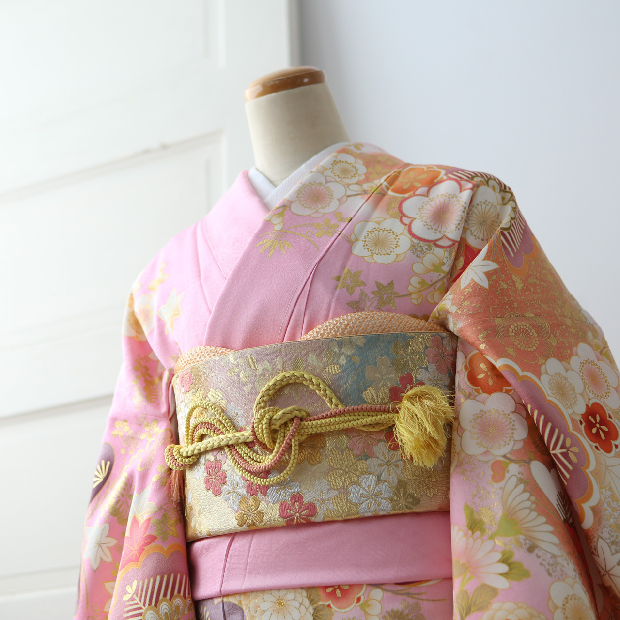 鮮やかなピンク地に花模様が散りばめられた着物に、ゴールドの帯が可愛らしいコーディネートです。