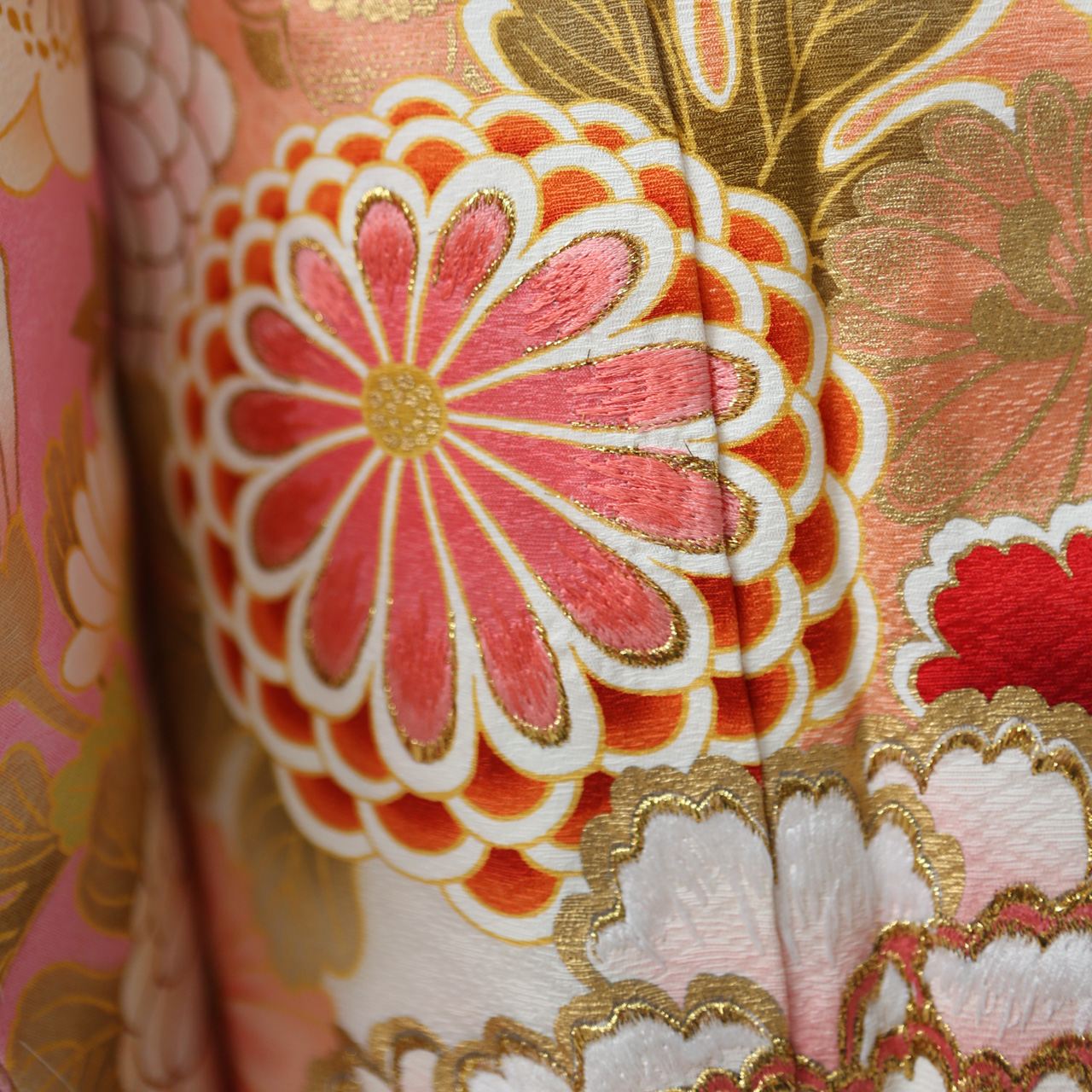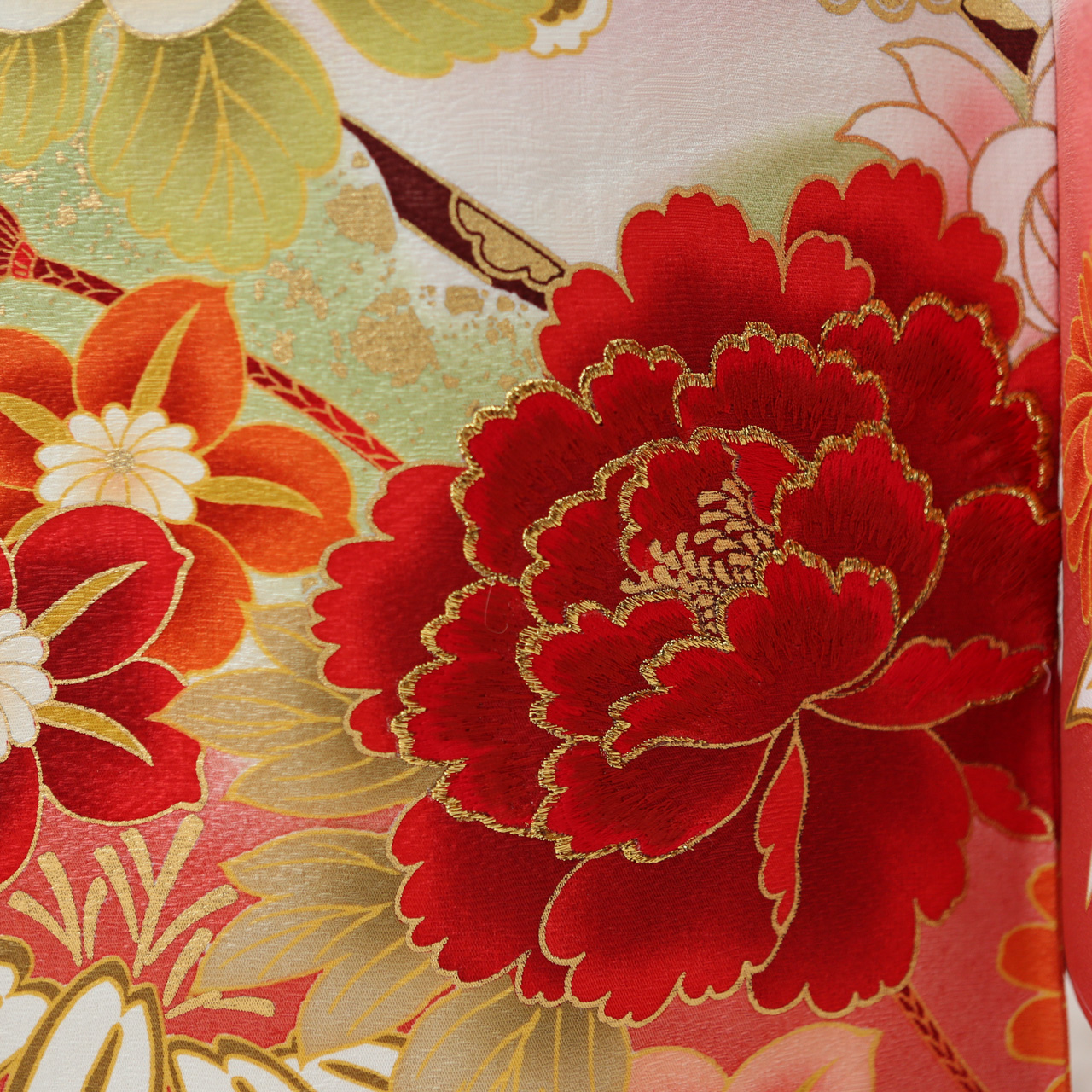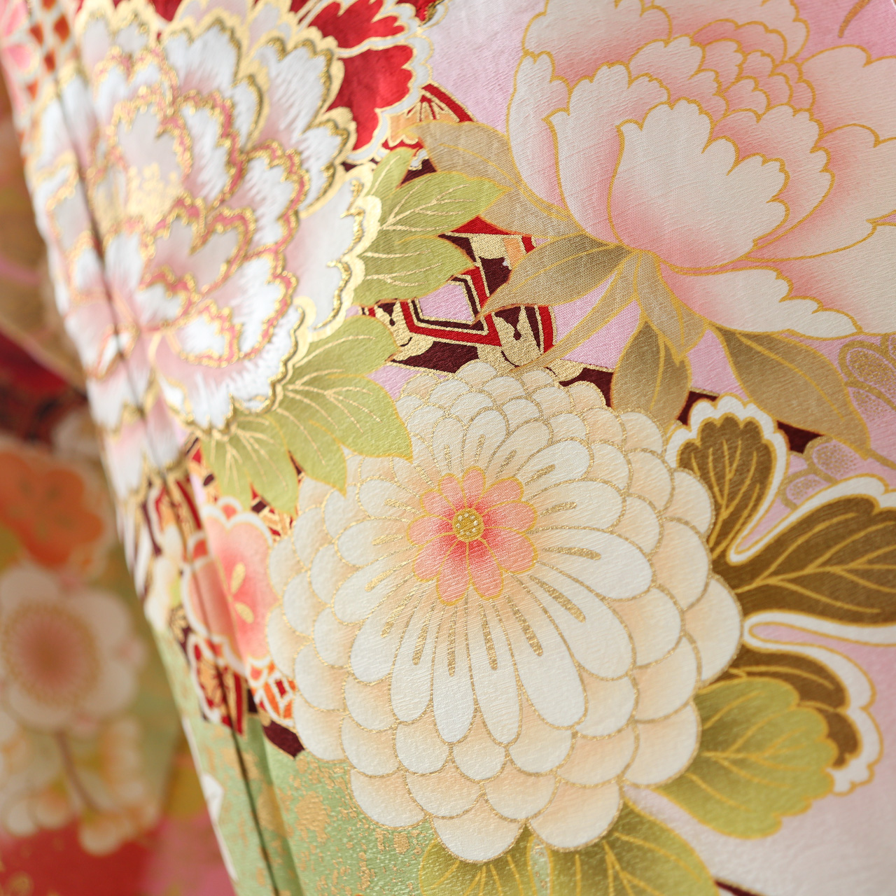 鮮やかなピンク地に花模様が散りばめられた着物に、ゴールドの帯が可愛らしいコーディネートです。