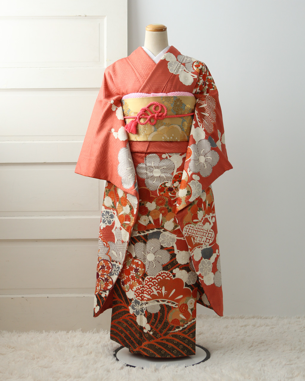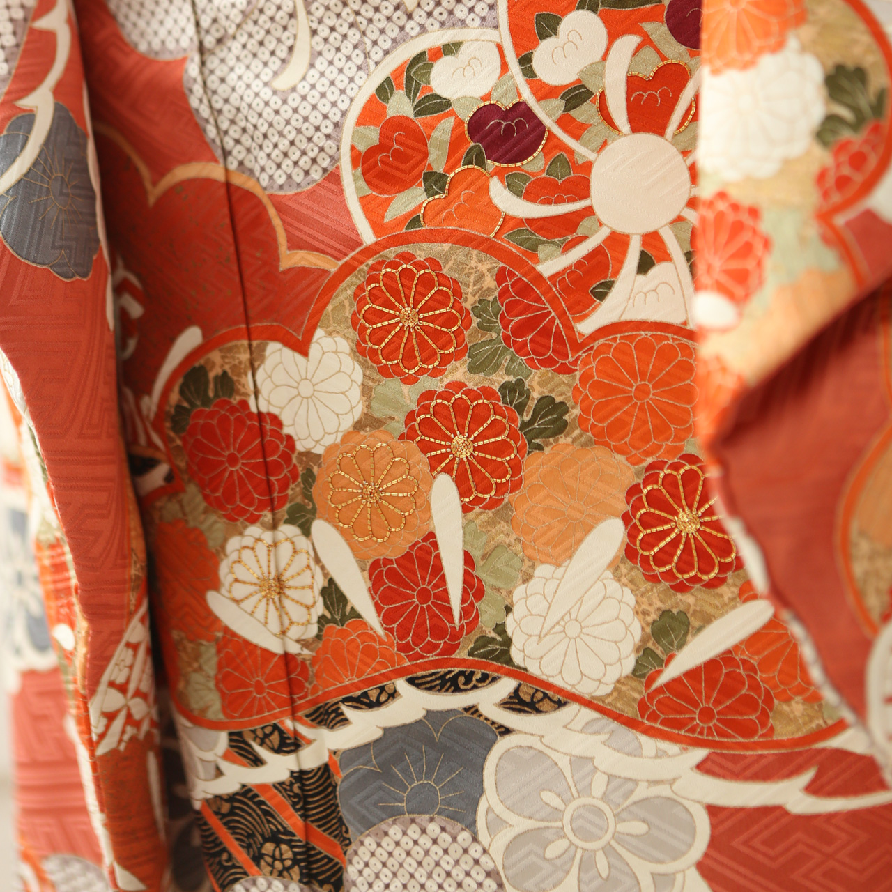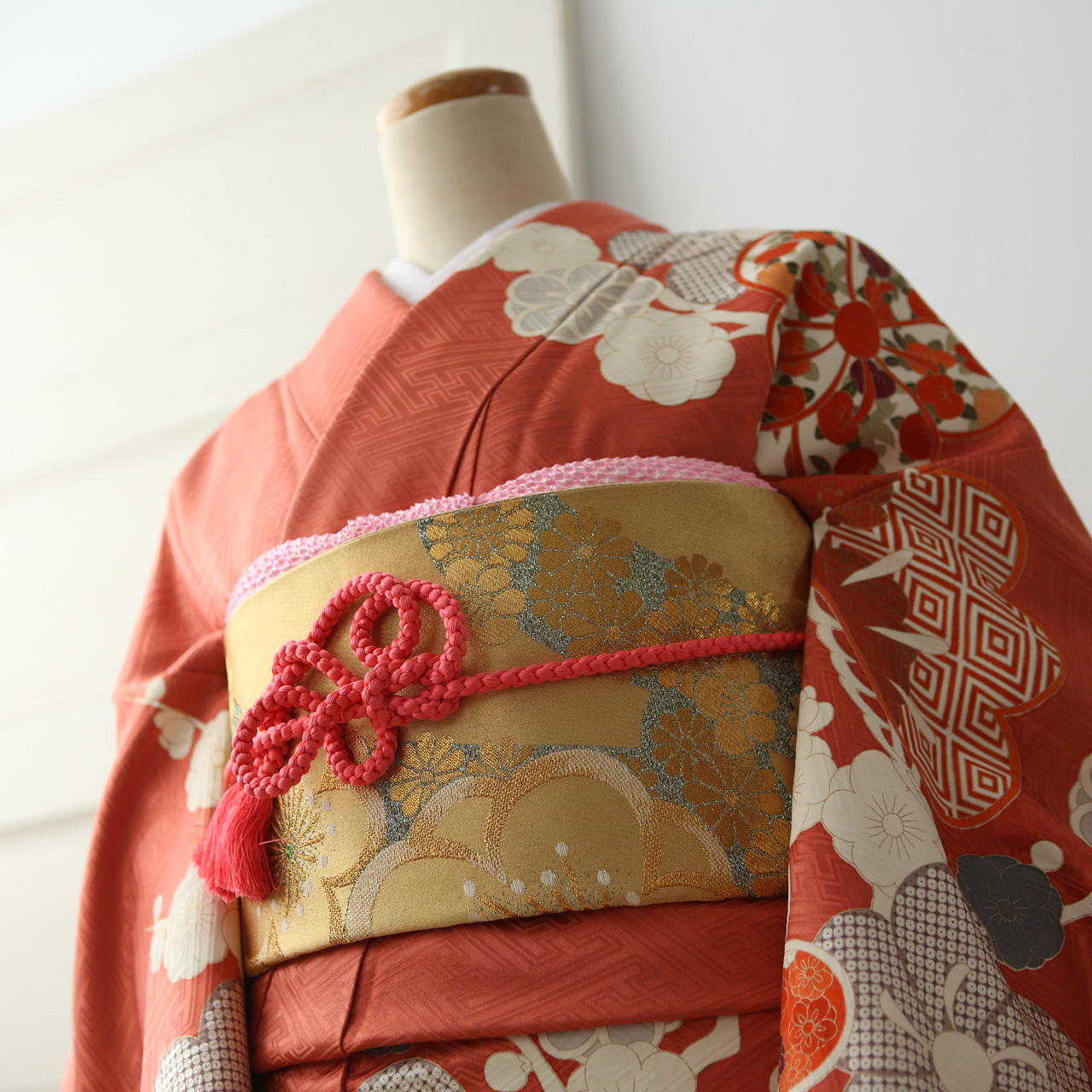 朱色の着物にゴールドの帯が可愛らしいコーディネートです。金糸の刺繍が華やかです。