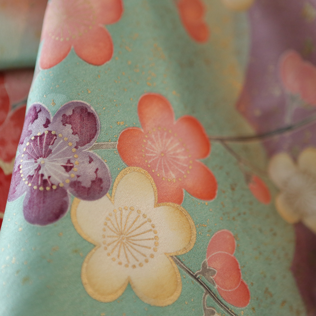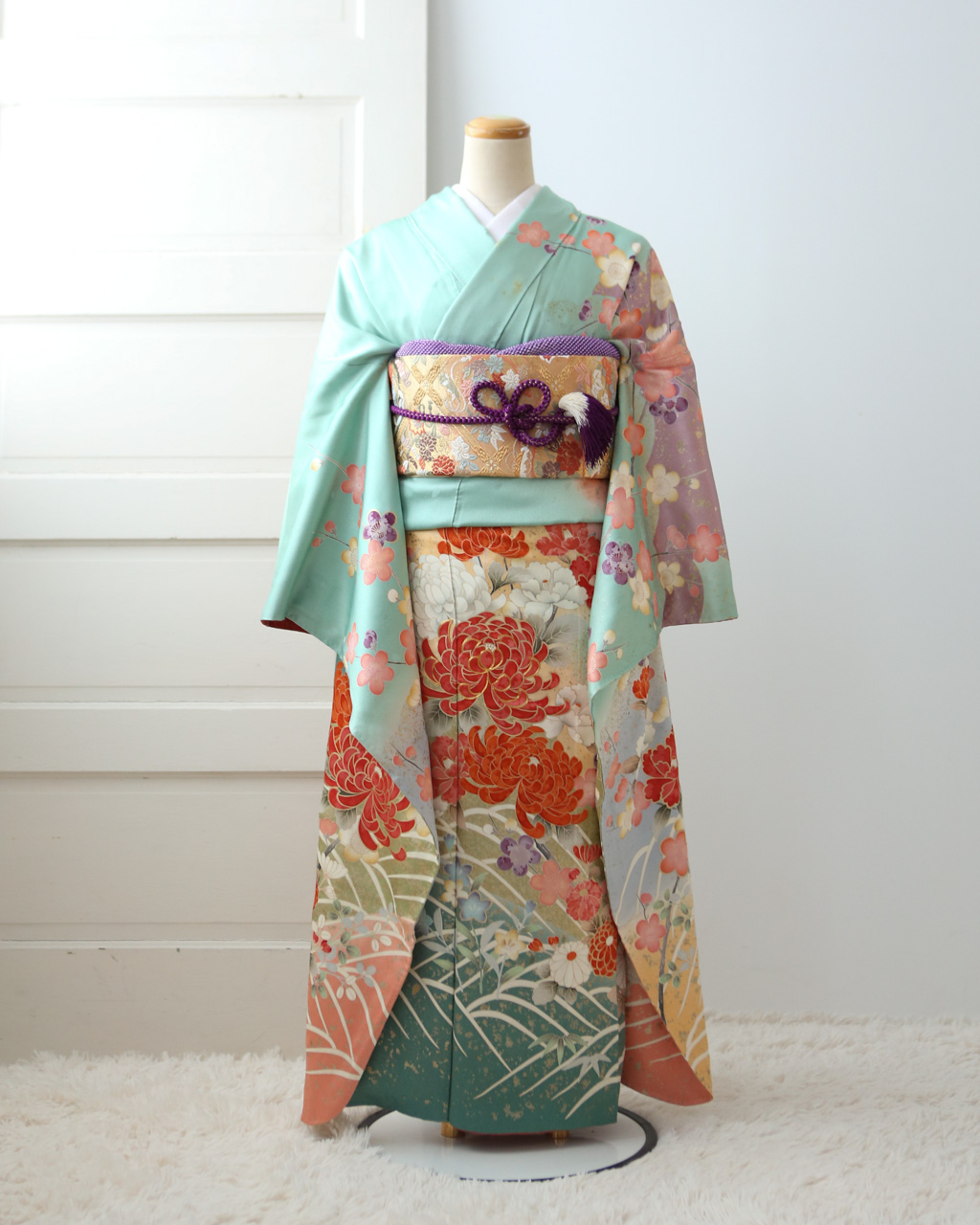 水色にピンクや紫が配された着物にゴールドの帯が可愛らしいコーディネートです。金糸の刺繍が豪華で立体感があります。