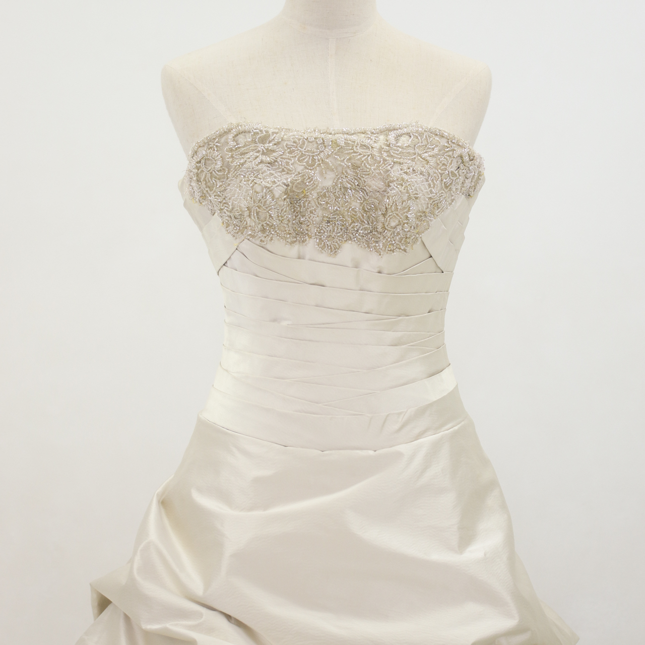 サテン生地の胸元に美しいビーズ刺繍があしらわれた、気品のある一着です。ウエストのクロスしたデザインがくびれを演出し、ボトムに広がるドレープとその下のチュールが美しく、大人な雰囲気があります。チュールの中の刺繍やフラワーモチーフなど随所にセンスが感じられます。