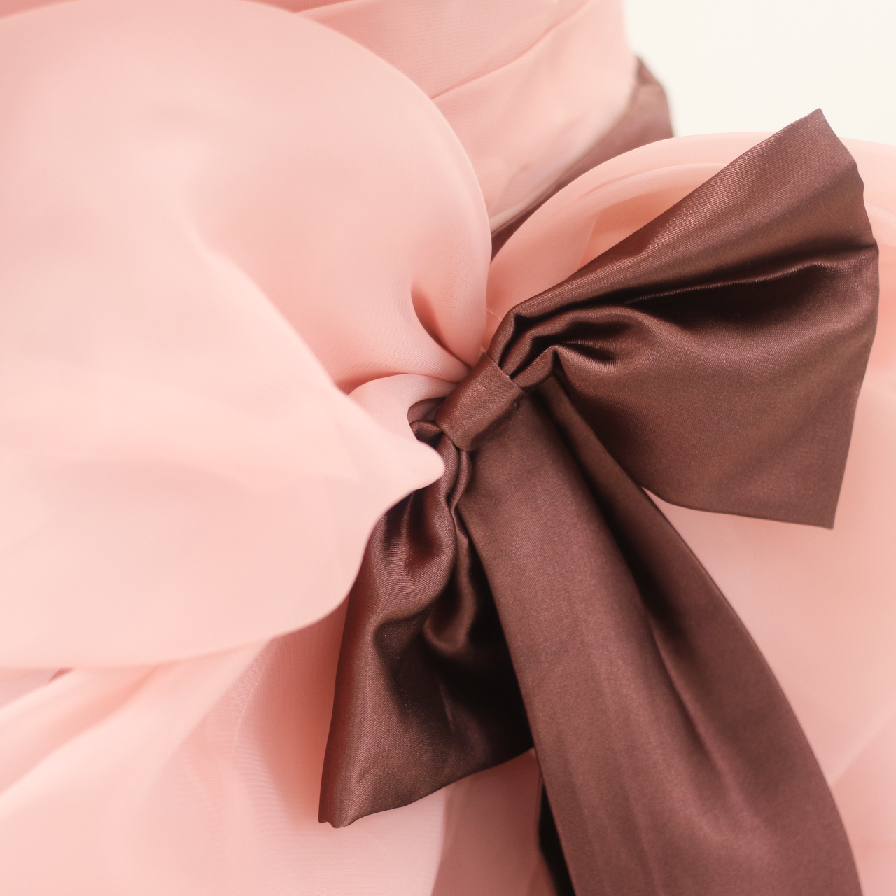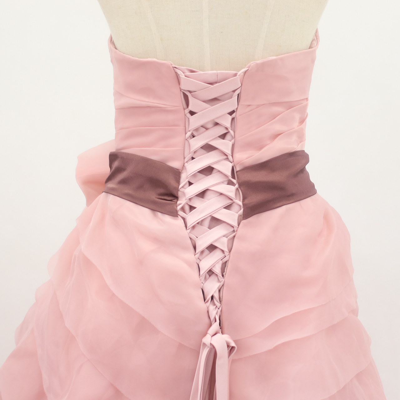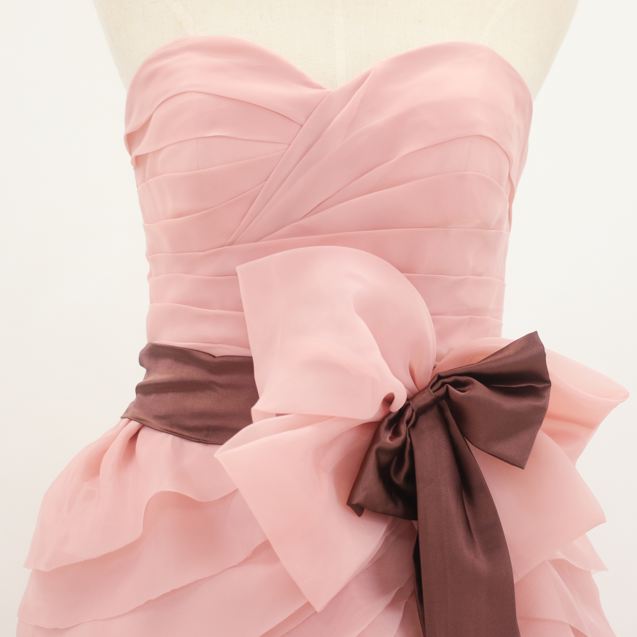 落ち着いたピンクの生地の重なりが広がり、ラフなディティールもお洒落なドレスです。胸元のハートカットがデコルテを綺麗に見せてくれます。腰に巻かれたブラウンのリボンとピンクの大きめのリボンがウエストを引き締め、スタイルよく見せてくれます。