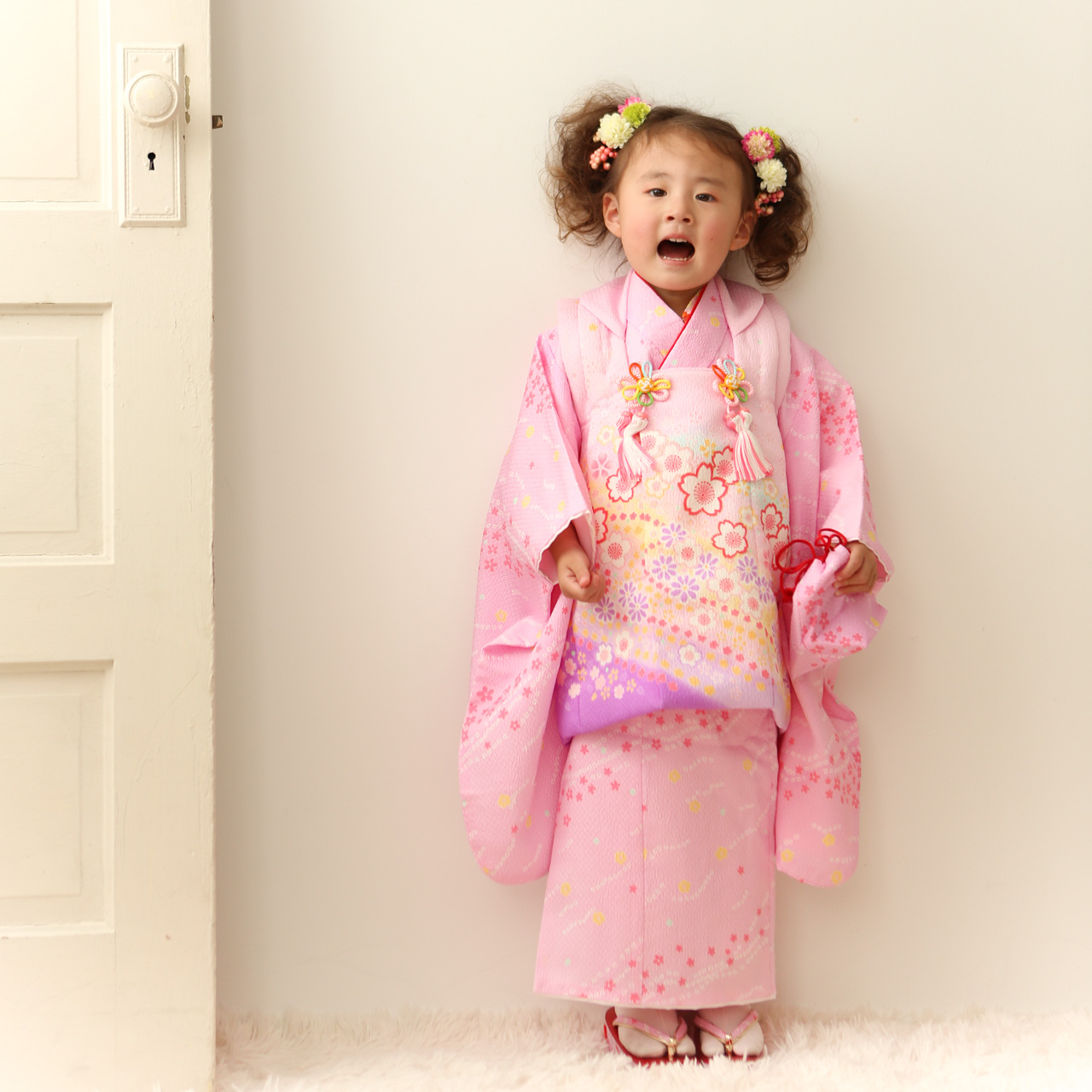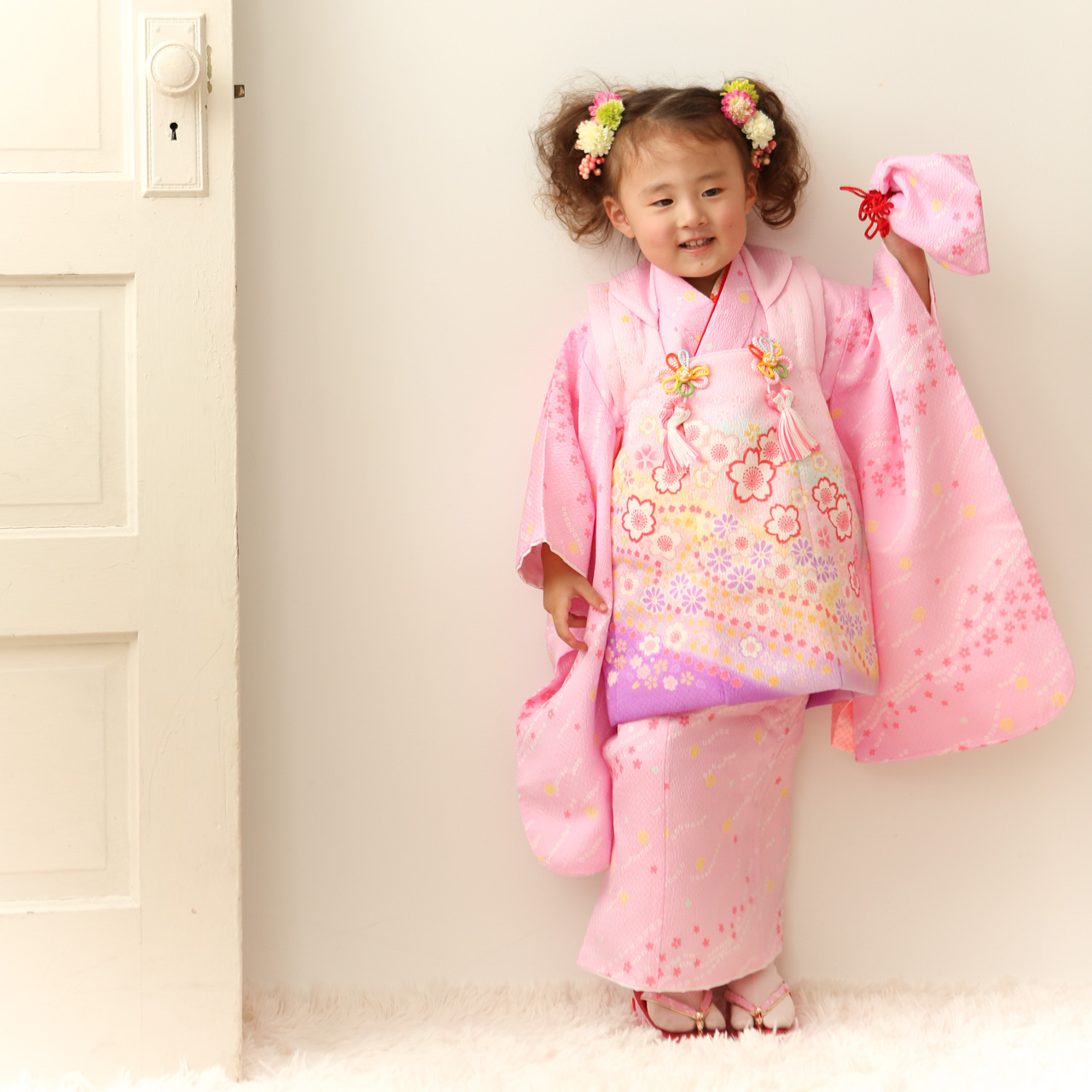 和装 | 七五三 PINK PURPLE 3歳被布 ¥5,000(本体価格¥5,500) サイズ:身長95cm-100cm カラー:ピンク・パープル 柄:花柄 小物:草履・髪飾り・巾着袋 淡いピンクとパープルに花柄が愛らしい衣装です。