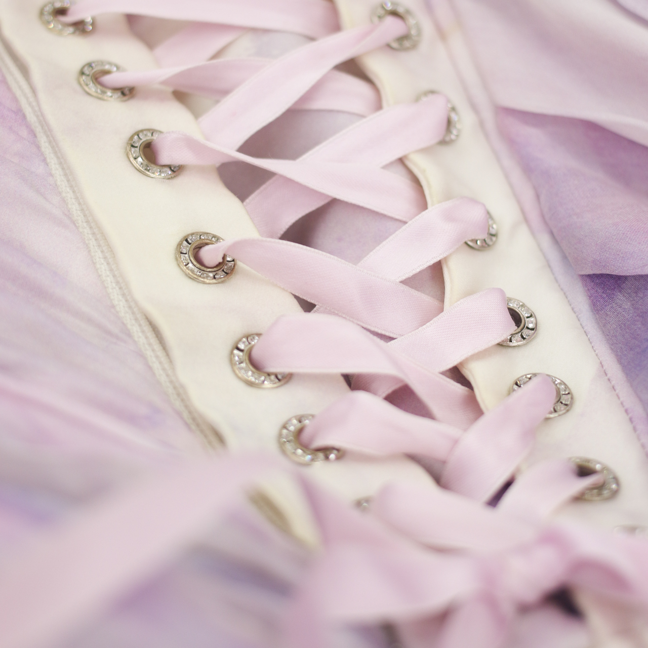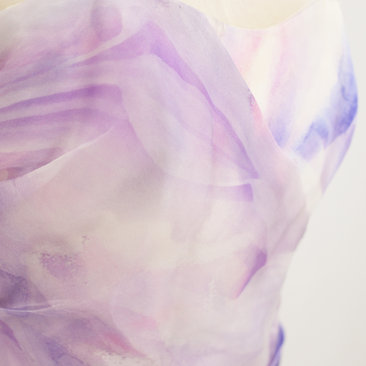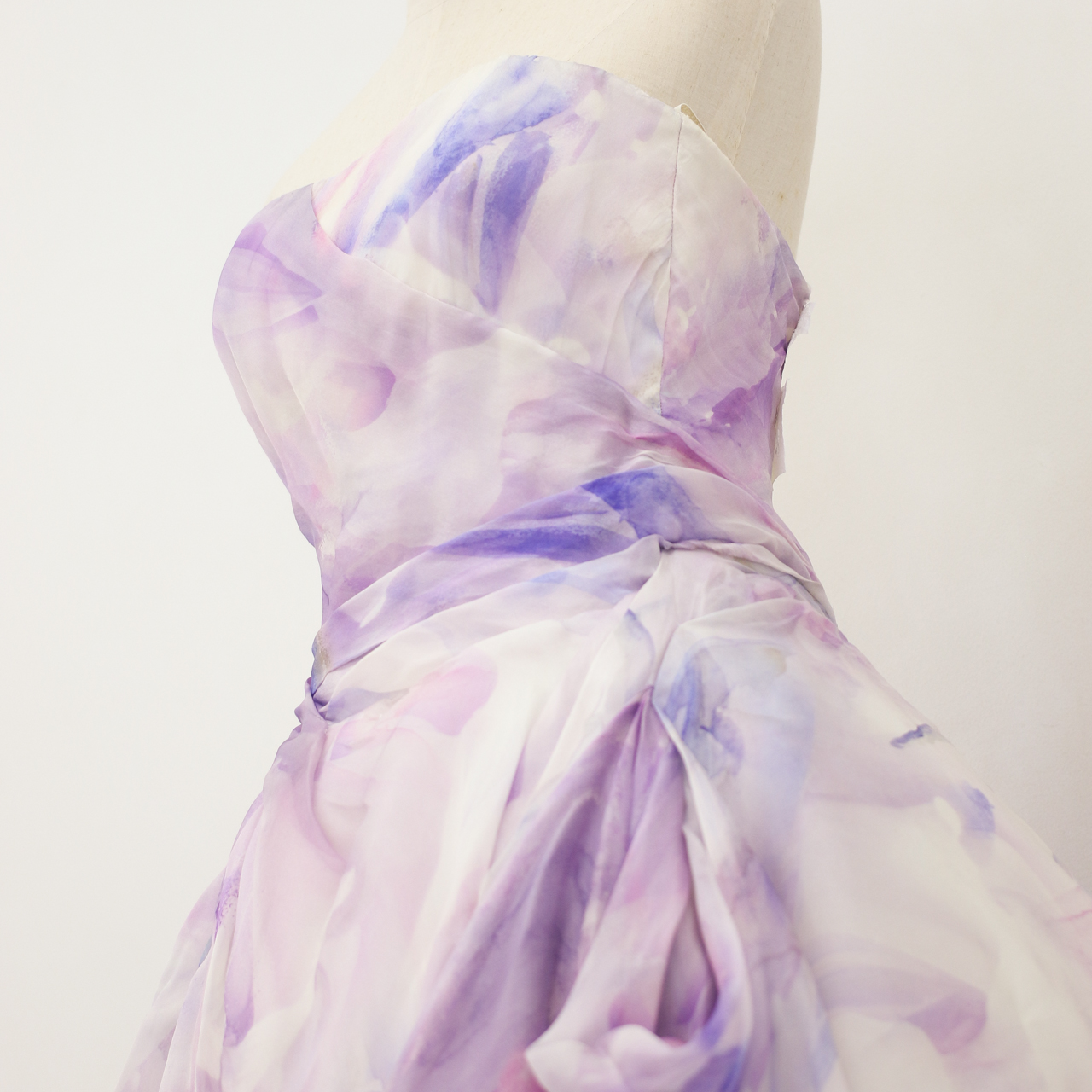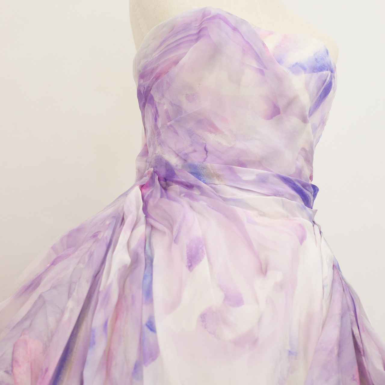 白いベースのドレスの上に、紫のマーブル模様のオーガンジーが重ねられた個性的なドレスです。紫のオーガンジーのドレープが華やかで、大人な雰囲気を醸し出します。ボトムの何層にも重ねられたチュールが美しいです。